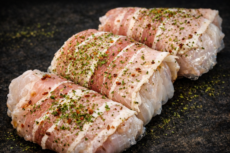 Heerlijke kabeljauw omhuld met ontbijt of katenspek. 15-20 minuten in de oven op 180 graden.