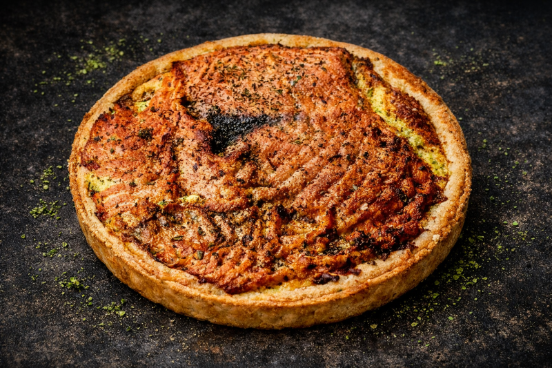 Heerlijke zalmquiche, enkel in de oven en je kunt aan tafel. Onze quiche wordt in punten aangeboden.