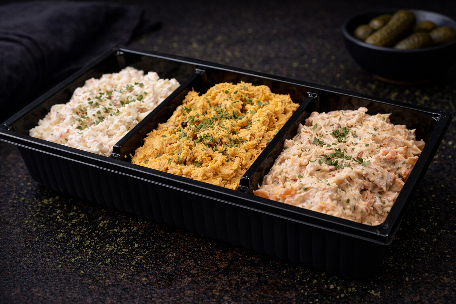 Rijkelijk gevuld met gerookte paling, haring OF sprotfilet, gerookte zalm, makreel, Hollandse garnalen en twee luxe salades.