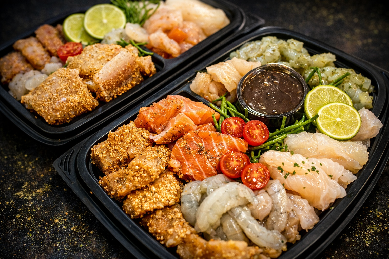 Rijkelijk gevuld met heerlijke verse vis (afhankelijk van de aanvoer) en een bakje marinade.