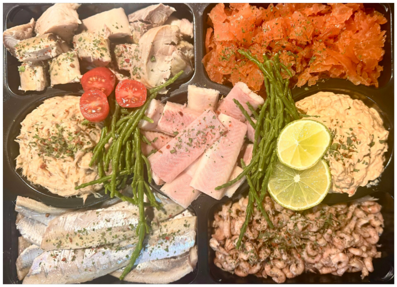 Rijkelijk gevuld met gerookte paling, haring of sprotfilet, makreel, gerookte zalm, Hollandse garnalen en een luxe salade.